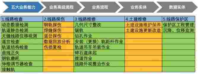 在轨道运维业务中,,,,,我们形成了完整的从业务能力(业务域)-业务流程-业务实体-数据模型的分析梳理过程。。。。。。。。。。。。。轨道运维业务能力如下图所示:::::::::::::